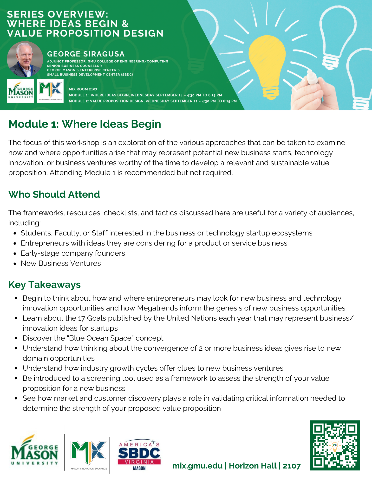 Explore how and where business opportunities start and examine which technology innovation and business ventures are worth development. Visit mix.gmu.edu to learn more!